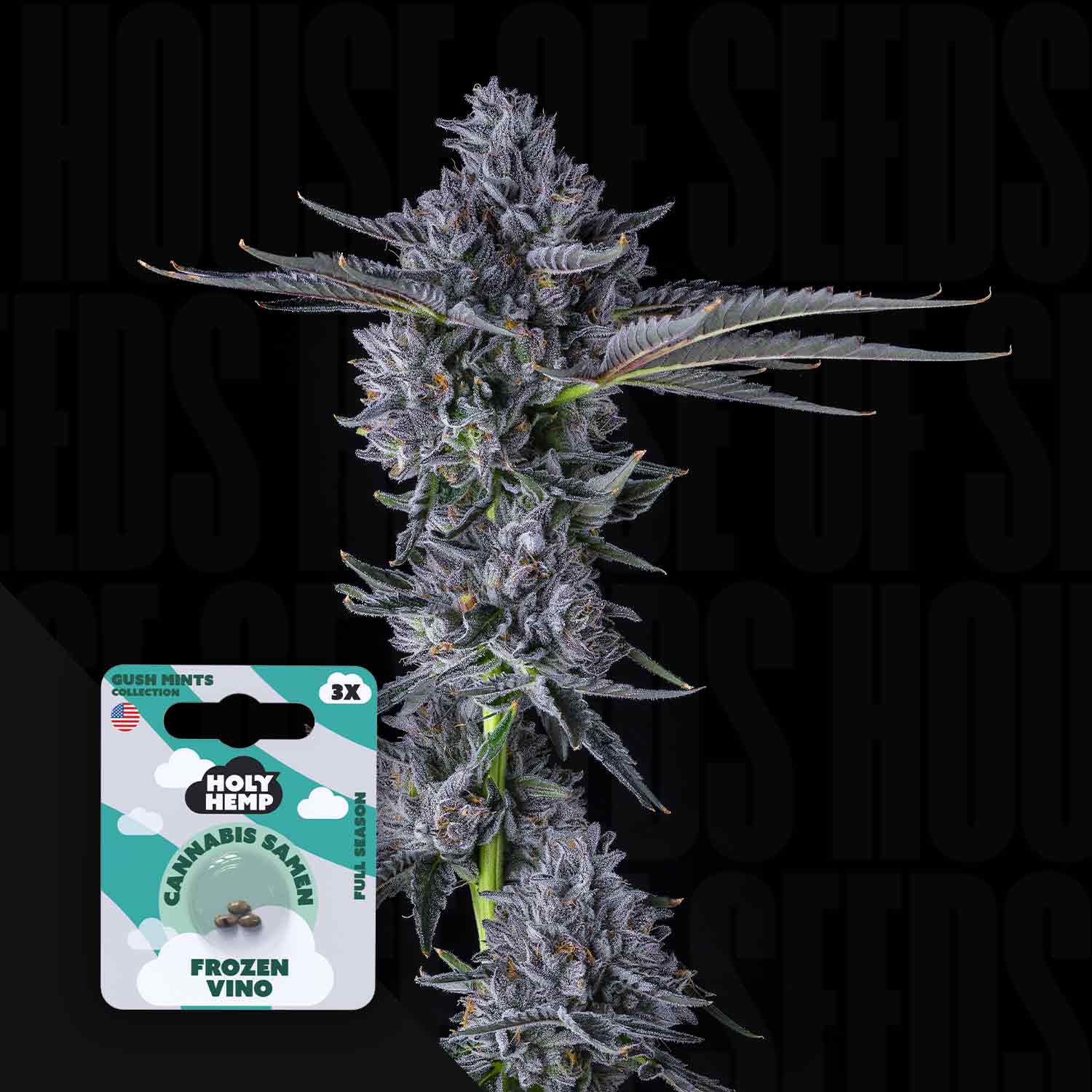 Frozen Vino is an indica-dominant hybrid strain that unfolds a complex and intense profile through its modern cross of Modified Grapes and Gush Mints. The plants develop a compact, bushy structure with strong side shoots, which are excellent for training techniques such as SCROG or LST. During the flowering period of about 56 to 65 days, dense, resin-rich buds with characteristic violet-black accents form, impressing not only visually but also aromatically. Under temperate to continental climate conditions, Frozen Vino unfolds its full potential and delivers medium to high yields. With a height of up to 1.5 meters, the strain remains well controllable and is therefore also suitable for demanding indoor setups. Thanks to its THC content of over 25%, Frozen Vino convinces with a pronounced potency that ranks among the premium strains both visually and in consumption.