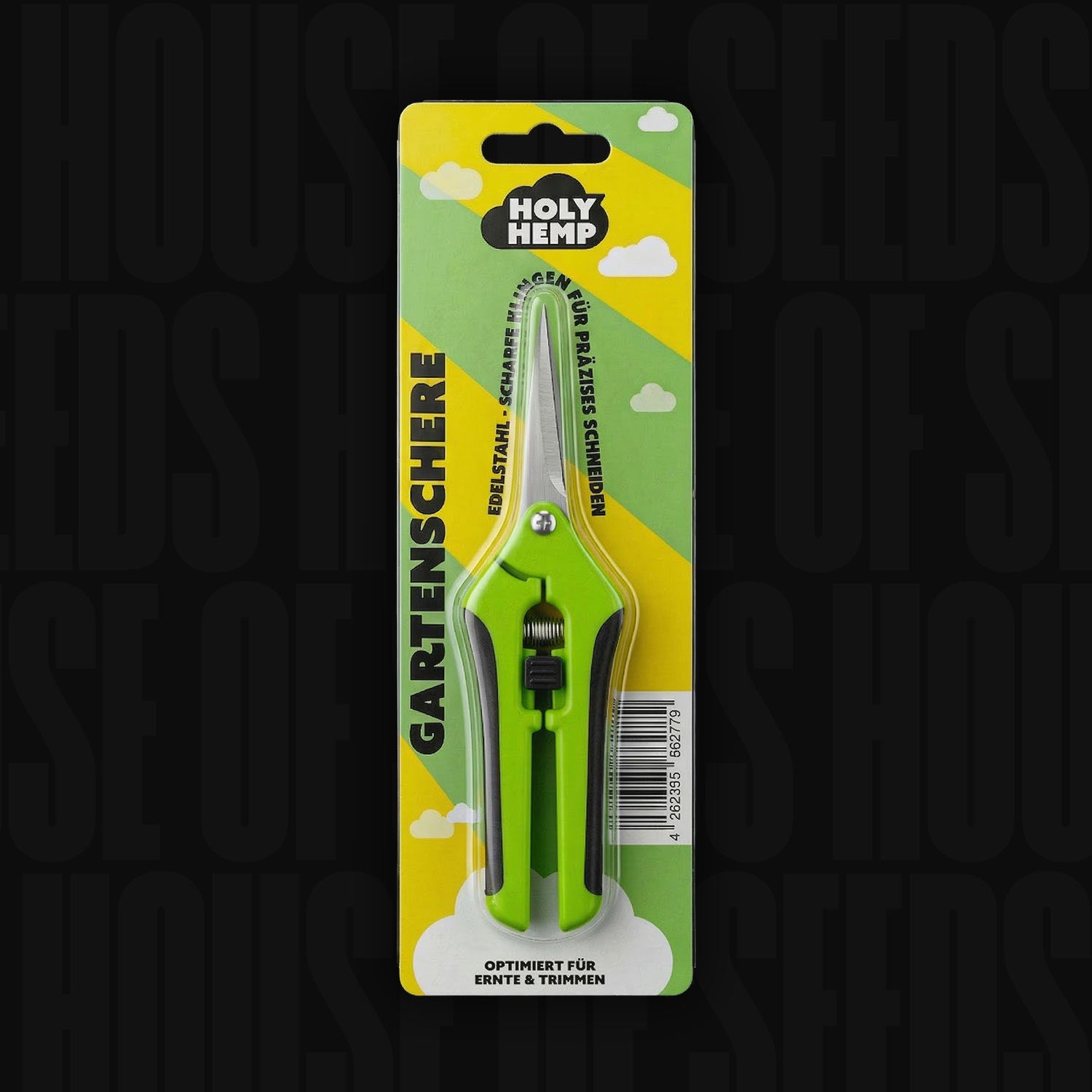 Holy Hemp Präzisions-Trimmschere in Ernte- und Trimmpackung vor schwarzem Hintergrund.