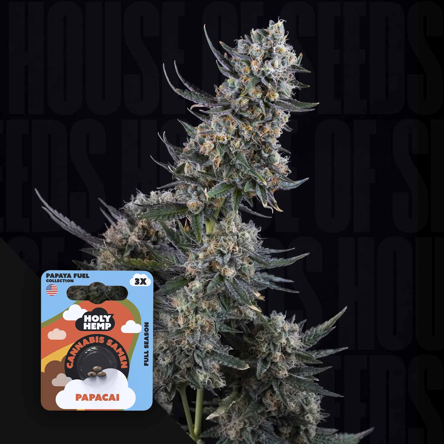 Papacai is an indica-dominant hybrid created by crossing Acai and Papaya Fuel. The strain impresses with a robust, bushy structure with strong side branches and a height of up to 1.5 meters. It requires about 56 to 65 days of flowering time and delivers medium to high yields that come into their own both in temperate and Mediterranean climates. The dense buds are rich in resin and covered with an intense layer of trichomes, which not only enhances the appearance but also indicates high potency. Even during the flowering phase, Papacai unfolds its characteristic aroma: a sweet-fruity blend of papaya and tropical notes, complemented by earthy and slightly spicy undertones. The high THC content of around 20 to 25 percent ensures that the strain can compete in strength with the best premium hybrids.