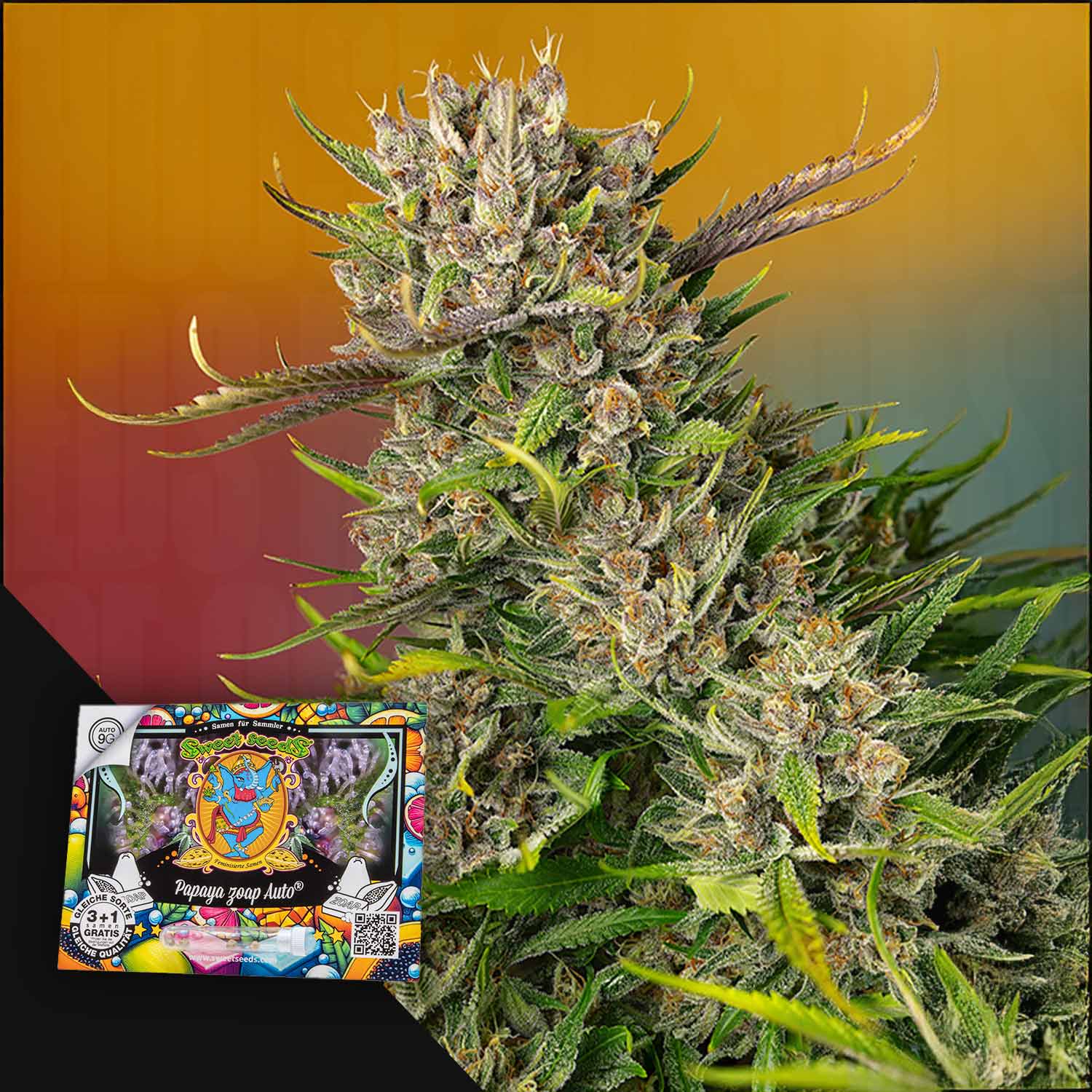 Papaya Zoap Auto delivers an exceptionally intense tropical-fruity aroma reminiscent of ripe papaya, mango, and sweet apricots, rounded off by the smooth, floral-diesel depth of the Zoap genetics. The plant grows powerfully and compactly, with dense bud structure and impressive resin production. The buds develop a creamy-sweet, almost gelato-like scent note typical of modern US hybrids. The effect shows a bright, clear, and euphoric hybrid profile. Ideal for creative activities, social moments, or relaxed daytime phases. The physical relaxation remains gentle and balancing without overshadowing the energetic head effect. Cultivation focus: Works very well in indoor cultivation under intense lighting. Responds positively to LST and general shaping techniques.\ Cross & result: Papaya × Zoap Auto -- tropical, creamy, modern, potent.\ Genetic features: Tropical-intense limonene/myrcene profile, strong resin formation, stable hybrid growth.