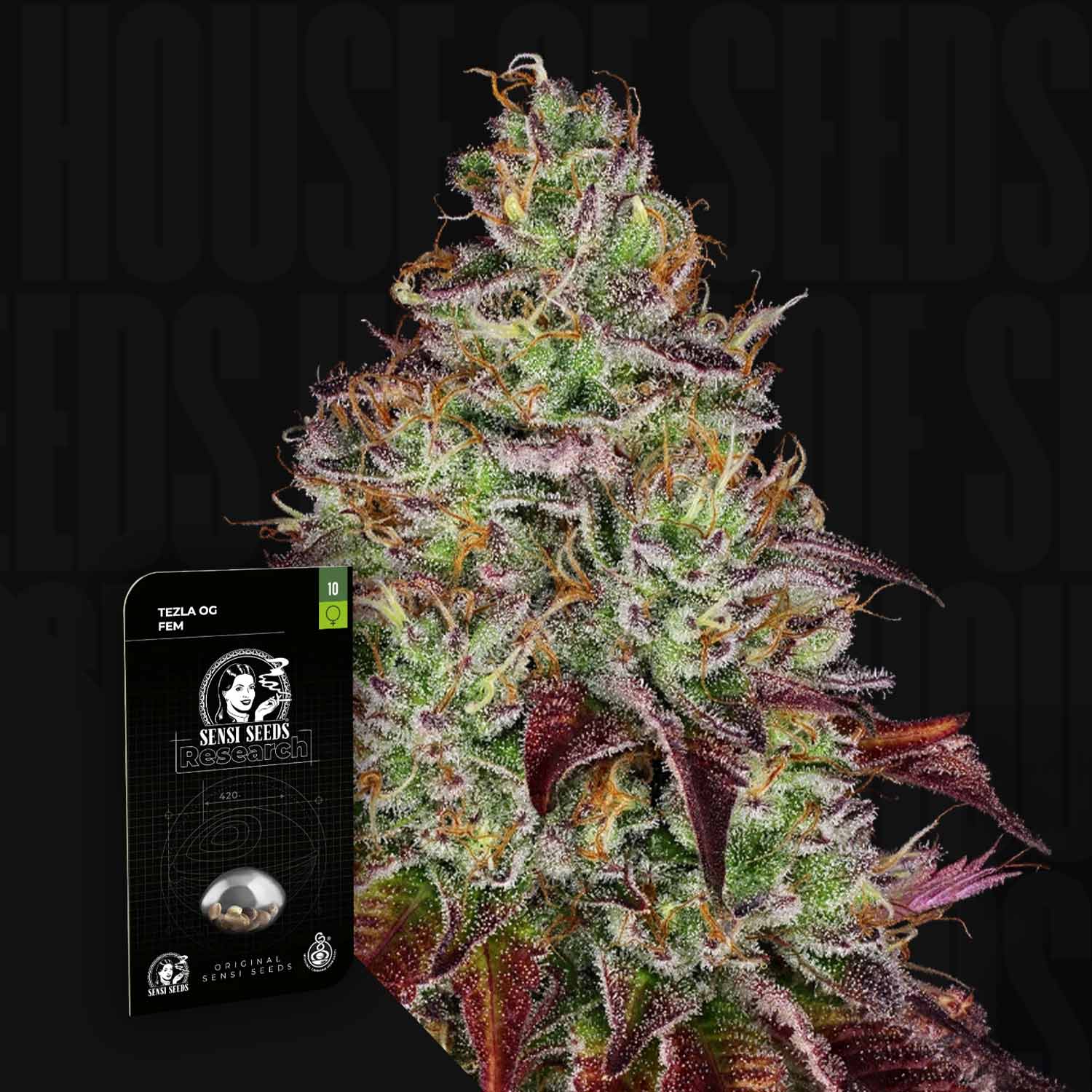 Tezla OG is a hybrid with a strong indica influence, bred by Sensi Seeds, combining the best traits of its parents Hash Plant, Shiva Skunk, and SFV OG. The strain presents a robust structure, growing compact like an indica but simultaneously forming conical, sativa-typical flower clusters. With a flowering time of about 56 to 65 days, it belongs to the medium-fast maturing strains and offers yields in the medium to high range. The plants are equally suitable for indoor and outdoor cultivation and show their full strength under temperate to continental climate conditions. During growth, Tezla OG develops strong shoots and forms dense, resin-rich buds that release a distinctive aroma. This combines spicy and earthy notes with a hint of citrus fruits and classic skunk influences.